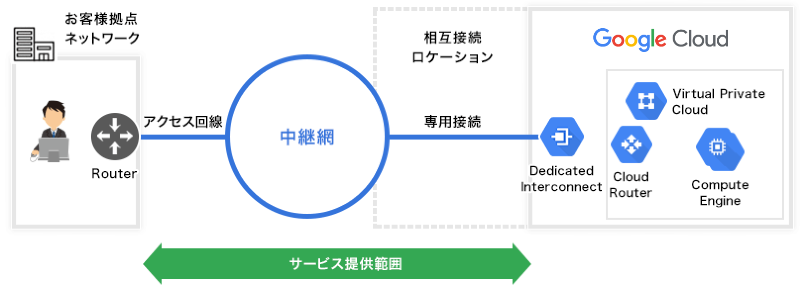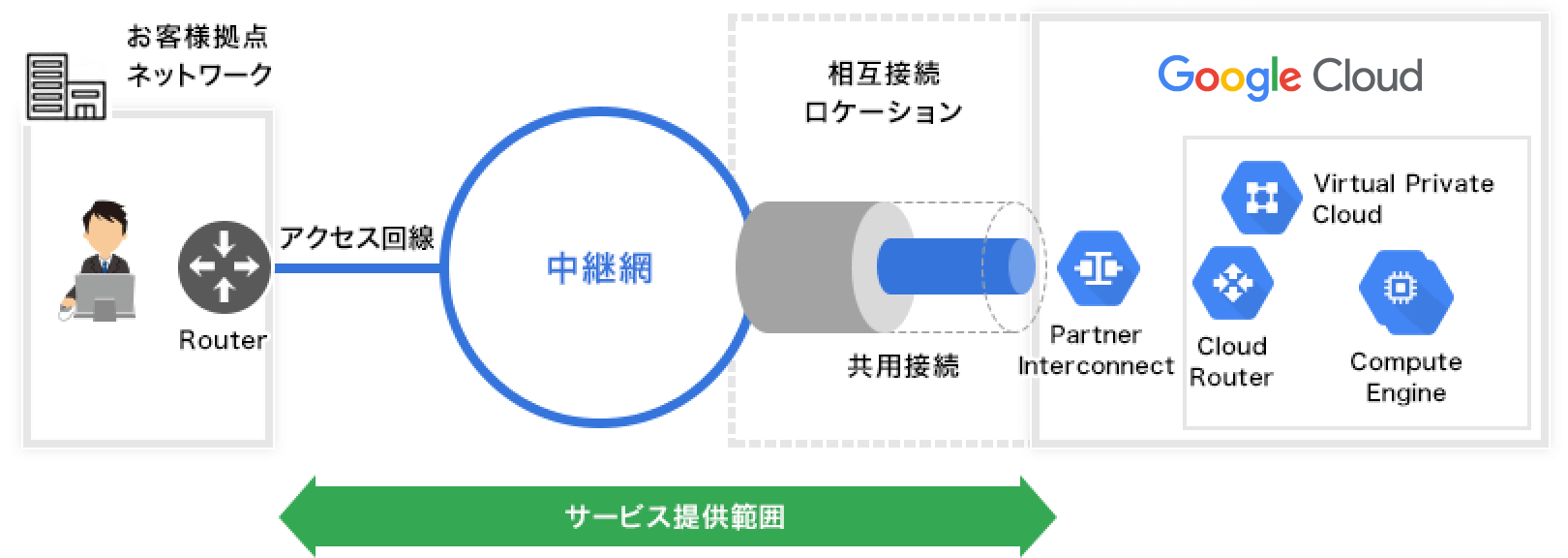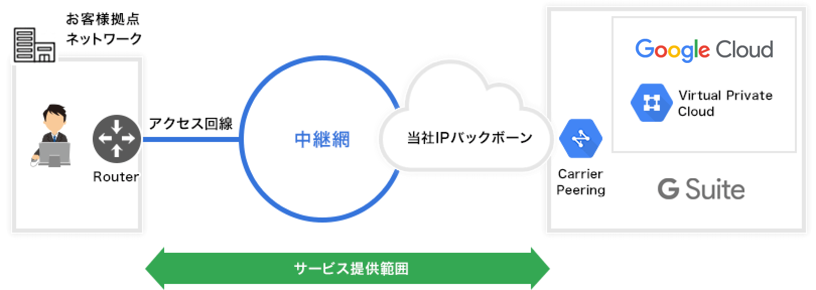 お客様拠点から当社IPバックボーンを経由してGoogle Cloudと接続する方式です。