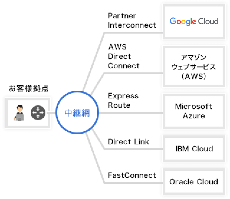 お客様拠点とクラウド間、複数のクラウド間を接続するルーティング機能を提供します。各クラウド接続用に、ルータや回線を用意することなく、1つのアクセス回線で複数のクラウドに接続することが可能となります。