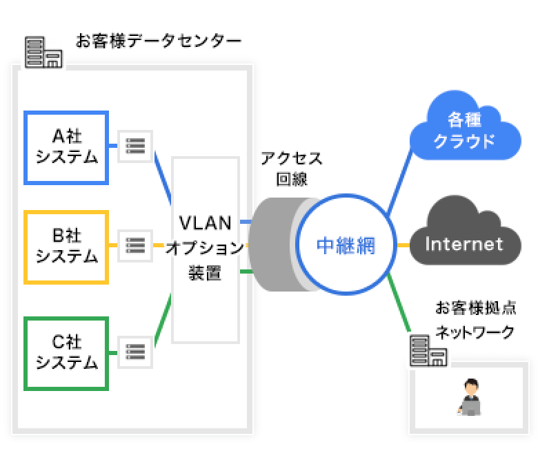 お客様拠点にネットワーク機器を設置し、複数の論理ネットワークを1つのアクセス回線に集約する機能を提供します。VLANにより論理的に独立したネットワークを構成することでセキュリティを確保いたします。