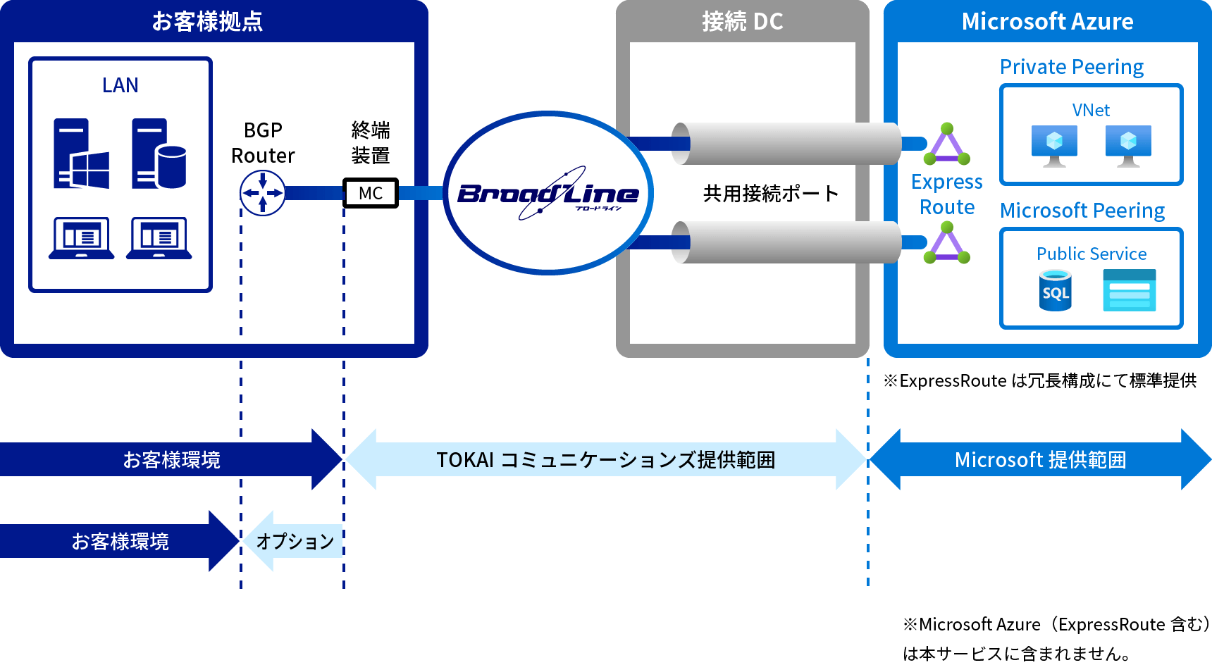 Azure接続サービスの提供範囲は、お客様拠点の終端装置からAzureとの接続データセンターの共有接続ポートまでとなります(お客様拠点の終端装置からBGPルータまではオプション提供となります)。詳細は、下記の図をご覧ください。